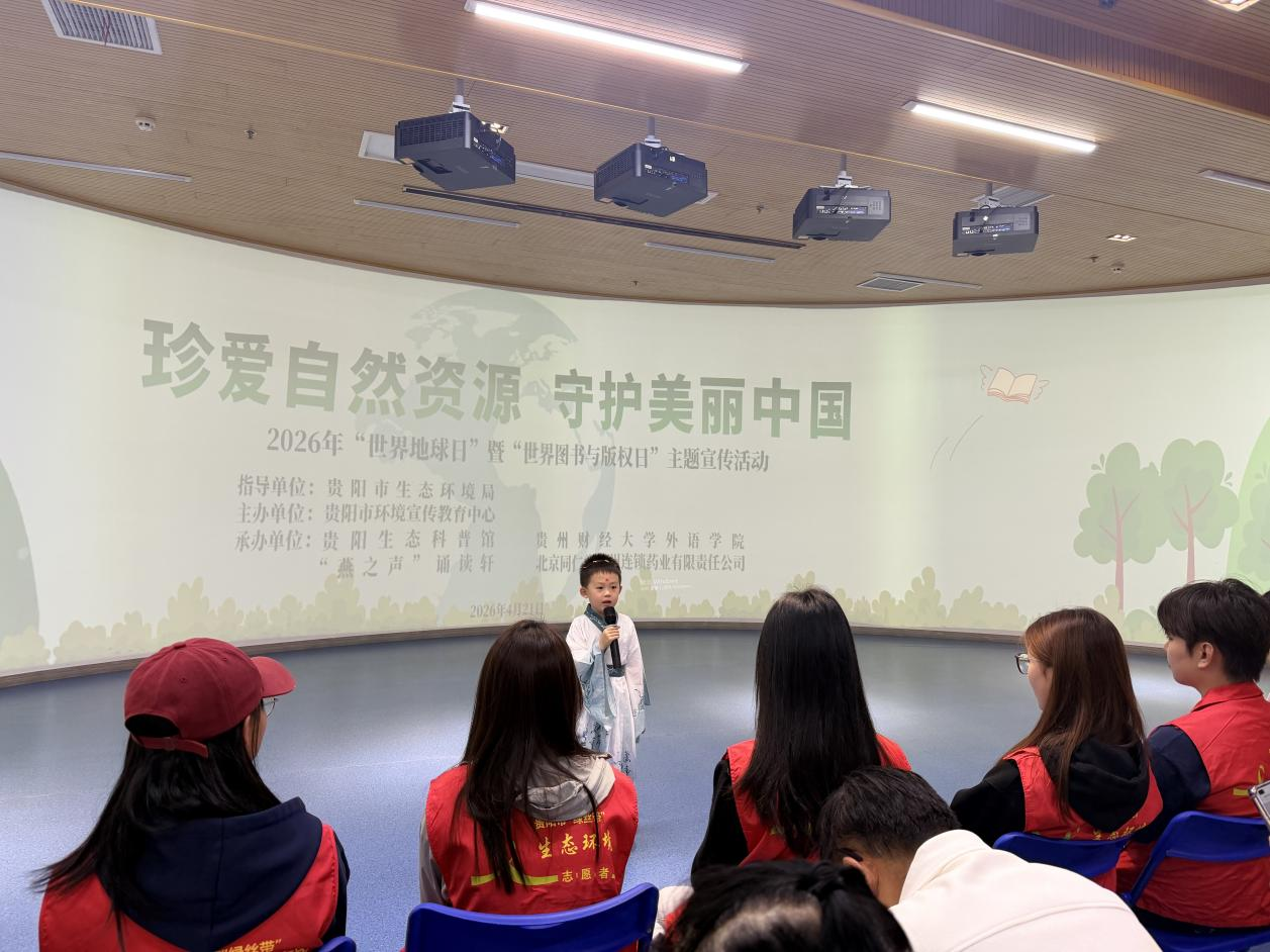 本次活动由贵阳市生态环境局指导,贵阳市环境宣传教育中心主办,贵阳生态科普馆、“燕之声”诵读轩、贵州财经大学外语学院、北京同仁堂贵州连锁药业有限责任公司联合承办。书香润心铸情怀,生态育人护山河,童声倡议聚合力,义诊服务暖民心,双节相逢让世界地球日更有温度、更有力量,持续绘就人与自然和谐共生的美丽贵阳新画卷。