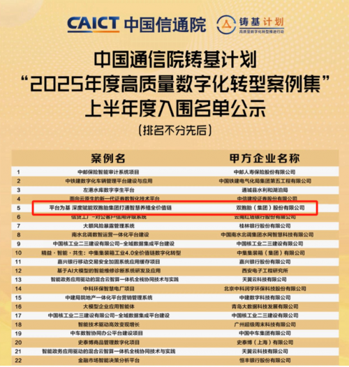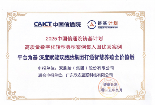 近期,中国信通院2025数字生态发展大会暨“铸基计划”年中会议发布了2025上半年度《高质量数字化转型典型案例》,欣农互联与双胞胎集团合作的“智慧养猪2.0”项目,凭借技术创新与行业示范价值,从金融、汽车、农业、航空等各行业领域共计543份案例中脱颖而出,为行业树立了高质量数字化转型标杆。