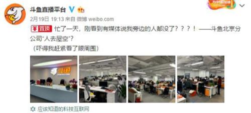 近日,有消息称,斗鱼北京分公司所在的优盛大厦7层多个办公室已人去屋空,员工寥寥无几,而在18层,只有一间办公室有部分员工。对此,斗鱼官方微博第一时间回应:北京公司正常运营,员工均到岗,并附上办公室场景照片。